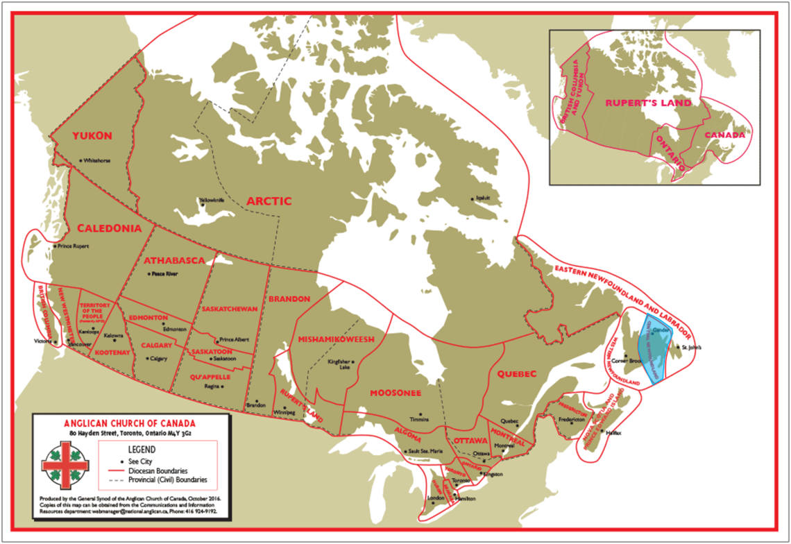 The diocese is situated in the traditional territories of the Beothuk and Mi'kmaq First Nations.
