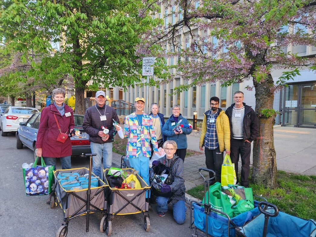 Tuesday evening was a perfect night to deliver the Easter goodies so generously provided by us, the St. Philip’s congregation. Rob Hosie was a hit in his colourful outfit which said “Happy Easter” to all he greeted. The socks filled with Easter treats were well received and appreciated by the folks on Pandora Ave. with many “God bless yous”.
